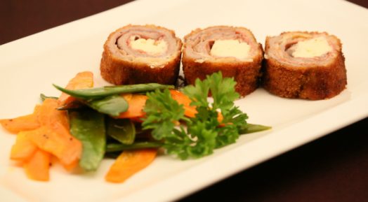 File De Vițel Umplut Cu Brânză Cu Mucegai Albastru Şi Învelit În Jambon (Cordon Bleu Clasic), Cu Mazăre Şi Morcovi