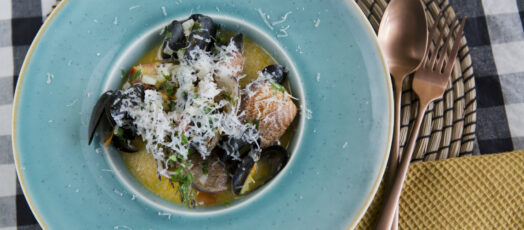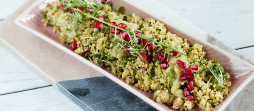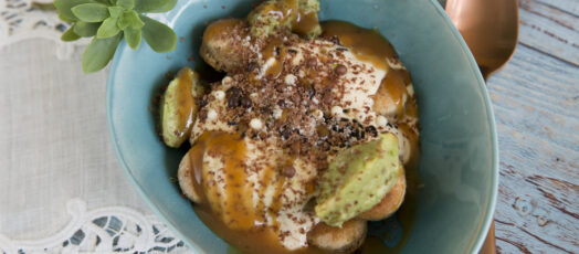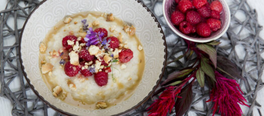 Orez sushi cu lapte de cocos, zmeură cu vanilie și caramel sărat cu fenicul
