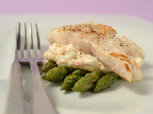 File De Peşte Alb Cu Garnitură De Sparanghel Şi Sos De Iaurt Cu Ardei Gras