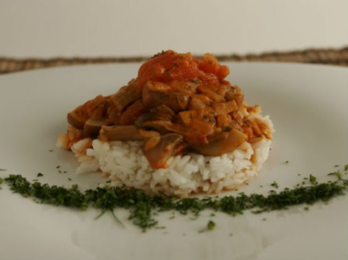 Mancare De Ciuperci Cu Ceapa Si Smantana Vegetala Si Garnitura De Orez