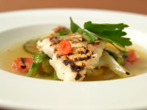 Șalău La Grătar Cu Sparanghel La Grătar Și Salată Ușoară De Roșii Cu Coriandru