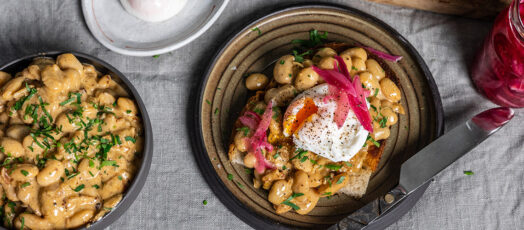 Fasole cu brânză şi ouă poşate, servite pe pâine prăjită