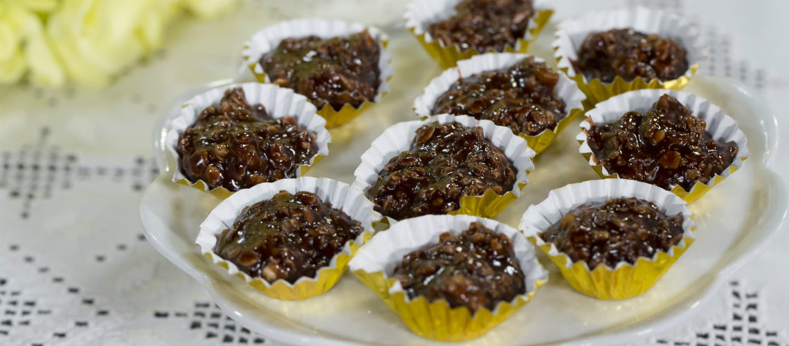 Punem fulgii de ovăz și nucile în acest amestec și formăm grămăjoare mici într-o tavă.