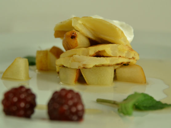 Din făină, apă ,ouă, zahăr şi lapte se obţine un aluat ca de clătite dar mult mai gros. În acesta se încorporează o jumătate de pară tăiată julien foarte subţiri. Într-o tigaie încinsă bine, unsă cu ulei, se fac 4 clătite groase ca cele americane, restul cantităţii de pere se taie cuburi medii, mici, care se călesc într-o tigaie cu foarte puţin ulei. Când acestea s-au călit se adaugă jumătate din cantitatea siropului de arţar şi o lingură de zahăr. Se mai lasă pe foc mare până când cuburile de pară se caramelizează. Frişca lichidă se bate cu zahăr până când devine pufoasă şi nu se mai simte zahărul. Cu ajutorul unei forme rotunde se taie clătitele. Într-o farfurie rotundă întinsă se pun alternativ cercurile cu clătite de pere, perele caramelizate, frişcă, în aşa fel încât să se facă 3 straturi alternative. Deasupra se adaugă o lingură de frişcă şi se ornează cu sirop de arţar, mure şi mentă.
