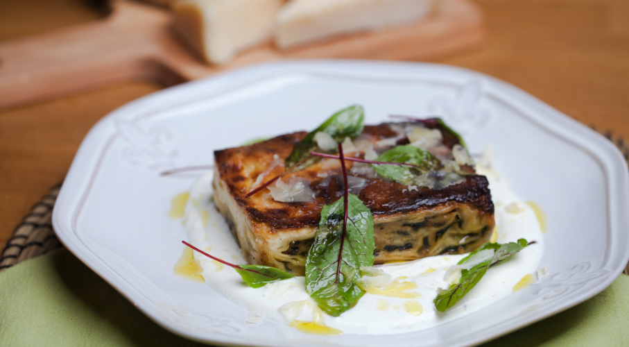 Amestecăm ingredientele pastei cu robotul de bucătărie, apoi frământăm cu mâna, până obţinem un aluat tare. Îl împachetăm într-o folie de plastic şi-l lăsăm să se odihnească în frigider. Călim în ulei de măsline hașmele şi spanacul.Le lăsăm să se răcească, apoi le amestecăm într-un vas cu ricotta şi gălbenuşurile. Condimentăm amestecul cu nucşoară rasă, coajă de lămâie, sare şi piper, apoi amestecăm totul cu parmezan. Întindem în fâșii lungi, cu maşina de făcut paste, aluatul odihnit, apoi tăiem dreptunghiuri pe care le umplem cu spanac. Formăm cilindri pe care îi aşezăm într-o formă de copt unsă cu ulei de măsline şi tapetată cu pesmet. Turnăm sosul peste paste. Le coacem în cuptor la 220 de grade, timp de 30-40 de minute.