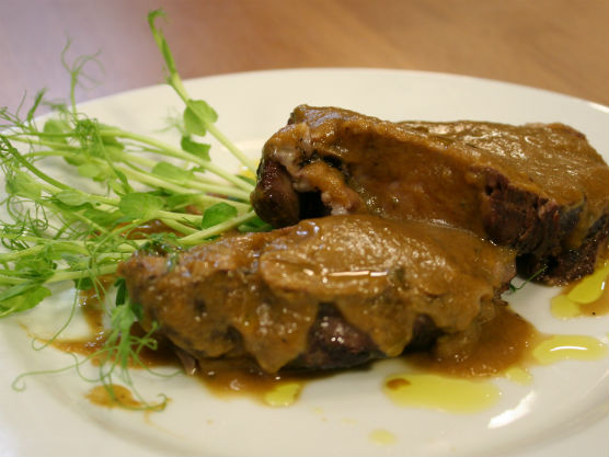 Se pune carnea la marinat timp de 12 ore cu mirodeniile şi 2 pahare de vin. Într-o cratiţă se încălzeşte uleiul şi se adaugă grăsimea de la şunca crudă, se pune ceapa şi morcovi tăiate foarte subţire apoi usturoiul. Se lasă la călit până se îmmoie şi se colorează la foc moderat. Se adaugă carnea legată cu aţă de bucătărie, se rumeneşte bine, se sărează, piperează, apoi se adaugă condimentele rămase. După 10 min se stropeşte cu vin la foc iute. Continuăm gătirea încă 10 min, se adugă al 2-lea pahar de vin şi se lasă să se evapore. Se adaugă supa caldă, se acoperă şi se lasă la foc mediu o oră şi jumătate. Se scoate carnea, se pasează cu mixerul sosul fără foi de dafin. După ce s-a răcit se taie feliuţe. Se serveşte cu sosul rezultat şi după preferinţă cartofi piure sau felii de cartofi fierţi.