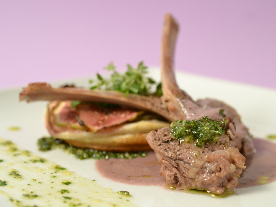 sparanghel verde. Se lasă cca 4 minute la călit, se adaugă un căţel de usturoi rondele, 10 g alune coapte zdrobite, şi se stinge cu 50 ml supă de vită care a fost amestecată în prealabil cu o linguriţă de sos de soia, plus piper proaspăt măcinat. Se pune apoi garnitura de broccoli si sparanghel în centrul farfuriei iar peste ea se aşează carnea de miel.