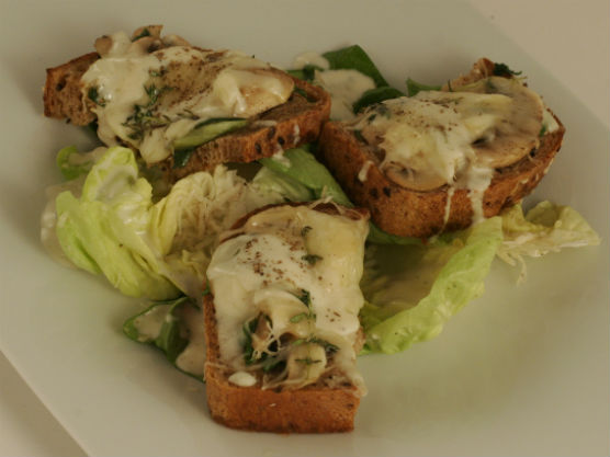 Pâinea se unge cu puţin ulei de măsline şi apoi peste ea se pun ciupercile şi ceapa verde călite în prealabil. Peste ele se pune caşcaval şi parmezan. Se pune totul la cuptor la 190 grade C timp de 7 min. În timpul acesta se face sosul de gorgonzola. Într-o tigaie se încălzeşte smântâna UHT şi când aceasta ajunge la 60-70 grade C se adaugă caşcavalul ras şi cuburi de gorgonzola,amestecându-se încontinuu până ce toate compoziţia devine vâscoasă. Într-un platou întins se aşează salata drasă cu zeama de lămâie şi ulei de măsline, peste ea crostini, şi apoi sosul de gorgonzola.