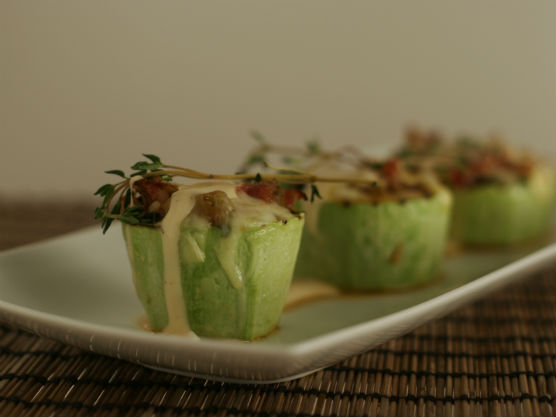 Dovleceii se taie transversal în jumătăţi sau în 3 bucăţi, funcţie de mărimea lor. Se scobesc în interior, scoţându-se seminţele şi obţinând un fel de cupă. Se pun pe grătar până când capătă urmele specifice grătarului. În acest timp baconul, ceapa, vinetele, ardeii, toate tocate se pun la călit în ulei încins timp de 4 min şi la final adăugăm sarea,piperul,busuiocul şi cimbrul uscat obţinându-se umplutura. Umplem dovleceii cu straturi alternative de caşcaval ras şi legume călite, apoi introducem în cuptor pentru 10 min la 160 grade C. În timpul acesta facem crema de caşcaval. Într-o oală mică punem la încălzit smântâna. O aducem la 60-70 de grade C, după care adaugăm sarea, piperul şi caşcavalul ras amestecându-se încontinuu până obţinem crema de caşcaval. Într-o farfurie întinsă punem dovleceii umpluţi peste care cu atenţie turnăm crema de caşcaval.