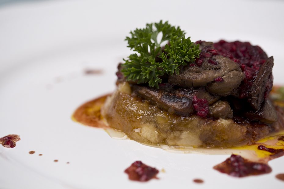 Într-o tigaie, se caramelizează merele (tăiate cubulețe) și zahărul brun. Separat, în altă tigaie, se prăjește ficatul de gâscă timp de 10 minute, până se elimină toată grăsimea. Se schimbă tigaia și se adaugă puțin unt și zmeura și se flambează cu coniac. Se așază merele caramelizate într-o farfurie și deasupra se adaugă ficat și sosul de zmeură.