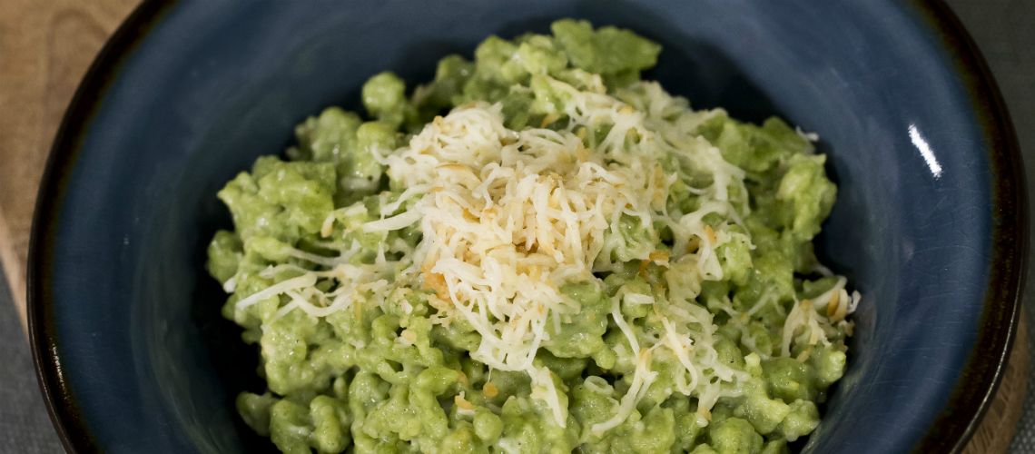 Amestecăm făina cu ouăle, sarea, usturoiul pisat, puțină apă și spanacul tocat cremă.