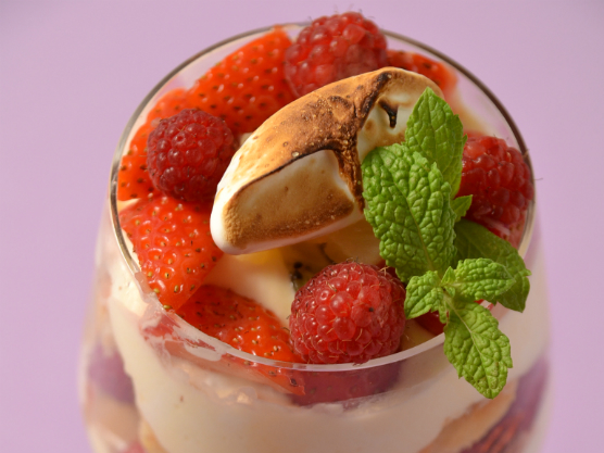 Cu mixerul se bat 200 g frișcă lichidă cu 2 lingurițe de zahăr până când se obține o frișcă foarte fermă. Aceasta se încorporează manual în crema de Mascarpone obținută din frecarea a 100 g Mascarpone cu o linguriță de zahăr și gălbenușul unui ou. Biscuiții se înmoaie în cca 60 ml de suc de compot de ananas. Ananasul din conservă se taie cubulețe, 50 g de kiwi se taie rondele fine, iar 50 g căpșuni medii se taie în sferturi. În două cupe largi de șampanie se așează mai întâi o parte a biscuiților însiropați, apoi, alternativ, o peliculă fină de gem de căpșuni, căpșuni, ananas, rondelele de kiwi și cremă de Mascarpone, Odată ajunși la suprafață, peste crema de mascarpone așezăm cca 30-40 g de fragi sau mure. În mijlocul acestora, cu ajutorul unui posh sau al unui spray de frișcă, punem crema obținută din frecarea albușului unui ou cu o singură linguriță de zahăr. Poftă bună și gătiți cu gust.