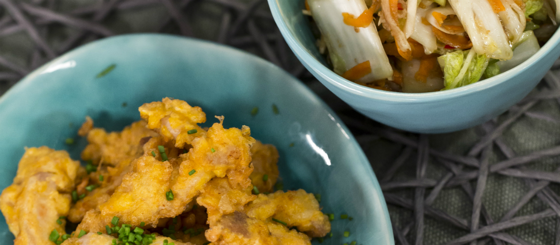 O servesc cu carne de porc tăiată fâșii subțiri, trecută prin amidon și ou și prăjită în ulei.