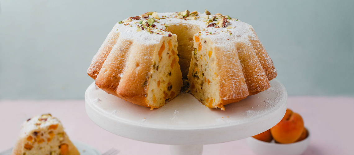 Separăm ouăle iar gălbenușurile le amestecăm cu zahăr și extract de vanilie până se albesc. Adăugăm uleiul, laptele și le amestecăm cu mixul de făină cu praf de copt și coajă de lămâie răzuită. Batem o spumă din albușuri și un praf de sare pe care o încorporăm cu grijă în aluat. Punem și caisele tăiate mărunt și fisticul tocat grosier.