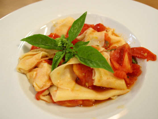 Mod de preparare: se amestecă făina cu gălbenuşul, ulei şi sare. Aluatul astfel obţinut se lasă să se odihnească 30 min. Se întinde şi se taie. Se prăjeşte usturoiul în 2 linguriţe de ulei, se adaugă roşiile tăiate bucăţele şi busuiocul. Se fierb pastele, se amestecă apoi într-o tigaie cu roşiile şi busuiocul. Pe o farfurie se aşează pastele şi se decorează cu frunzele de busuioc.