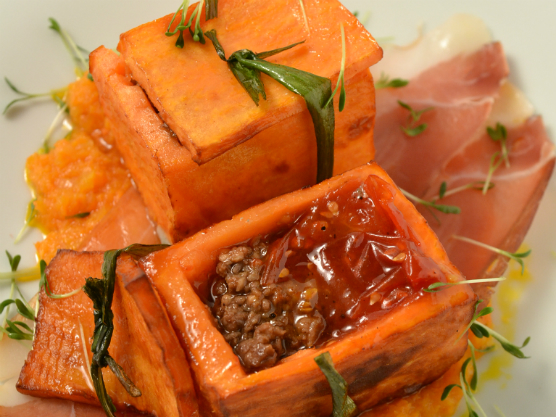 Carnea de vită se pune la călit în 30 ml ulei încins de măsline. Se stinge cu 20ml sos Worchester și se adaugă sos barbecue, sare și piper. Se lasă să se pătrundă și să devină o compoziție densă și se ia de pe foc. Într-o altă crăticioară se pun la călit în 20 ml ulei vegetal încins 10 roșii cherry tăiate sferturi. Se adaugă apoi 20 ml miere de albine și două linguri de apă și se lasă la scăzut, până se obține un gem. Se adaugă sare și ceva mai mult piper. Din patru cartofi dulci se porționează 4 paralelipipede de lungime cam 8-10 cm. Din aceste paralelipipede se taie de pe partea lungă o felie subțire care va constitui capacul pachetului de cartof. Partea rămasă a paralelipipedului, corpul, va fi scobită, obținându-se o cutiuță. Aceasta va fi umplută cu carnea de vită călită, cu gemul de roșii cherry și cu cca 80 g de brânză Roquefort (2 pers/4 pachețele). Cutiuța de cartof se va acoperi cu capacelele obținute înainte, se vor lega cu frunze de ceapă verde care au fost în prealabil opărite și se vor pune la prăjit în baie de ulei încins timp de 5 minute. Se scot pe șervețele pentru a se elimina tot uleiul. Cu părțile de cartofi rămase din construirea pachetelor se face un piure cu sare și piper și cubulețe călite din cca 1 ceapă albă, medie. În farfurie se vor așeza 2 felii fine de proschiuto crudo, peste ele piure-ul și peste piure pachețelele de cartofi, dispuse vertical. Prin farfurie se vor arunca firicele de cressin. Poftă bună și gătiți cu gust.