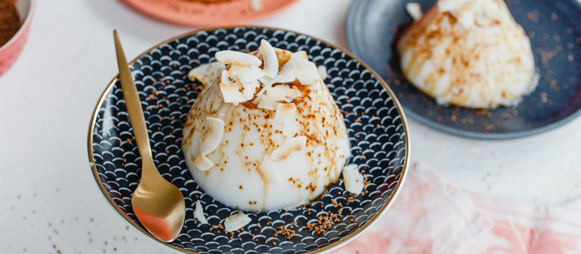 Într-un vas mai mic încălzim laptele de cocos cu frișca de cocos și cu zahărul. Doar până ce se dizolvă zahărul, apoi luăm vasul de pe foc și lăsăm să se răcească puțin. Adăugăm gelatina și omogenizăm bine, ca să nu rămână cocoloașe. Îl împărțim în forme și îl lăsăm cel puțin 6 ore în frigider.