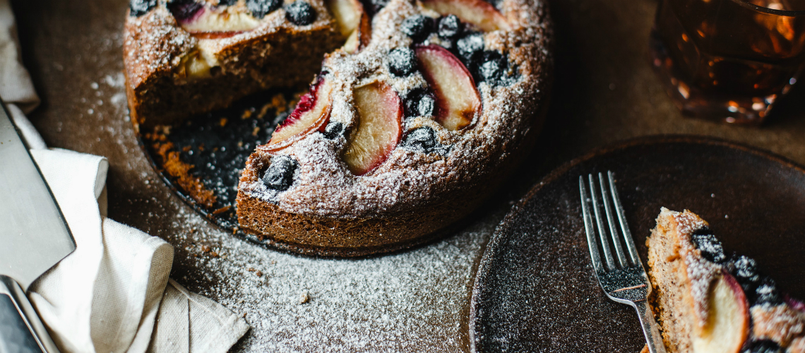 Turnăm aluatul într-o formă de copt, așezăm deasupra piersicile tăiate felii și afinele, printre ele. Se coace în 45 de minute în cuptorul preîncălzit la 180 de grade. După ce scoatem prăjitura din cuptor, o lăsăm să se răcească pe un grilaj și o servim presărată cu zahăr pudră.