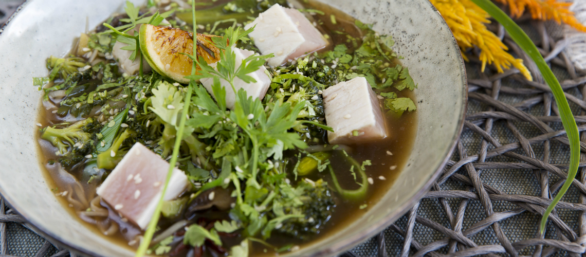 Fierbem 700 ml de supă de bază pe care-i suplimentăm cu încă 300 de ml apă. Adăugăm tăițeii și-i fierbem 5 minute. Adăugăm legumele și celelalte ingrediente și le mai fierbem 10 minute. Asezonăm cu sare, piper, coriandru și după gust, ardei chili proaspăt. Îl servim cu cubulețe de ton.