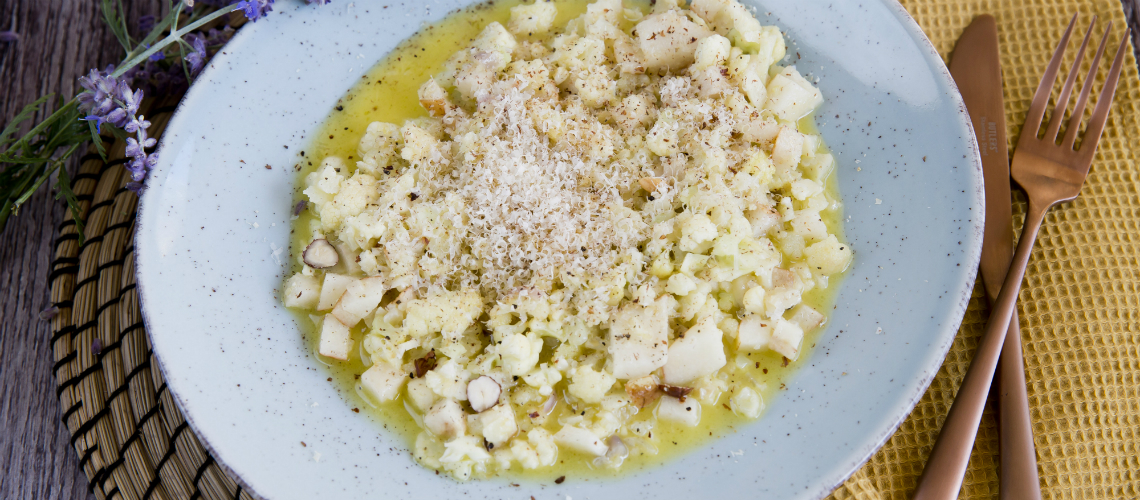 Călim ceapa și usturoiul tăiate cubulețe în amestec de ulei și unt. Adăugăm parmezan și unt. Curățăm conopida romanesco, o blanșăm în apă fierbinte și preparăm o vinegretă din oțet, ulei și zeamă de lămâie. O servim cu pere nashi și rizoto de conopidă.