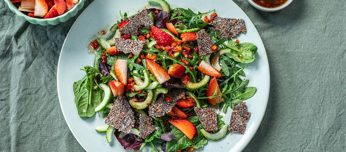 Pentru salată, tăiem castravetele în jumătate pe lungime, scoatem semințele și îl tăiem felii. Spălăm căpșunele, le scoatem codiţele și le tăiem în felii. Amestecăm castravetele și căpșunele cu frunzele de salată, le amestecăm cu sosul și le servim cu biscuit crocant din semințe de in.