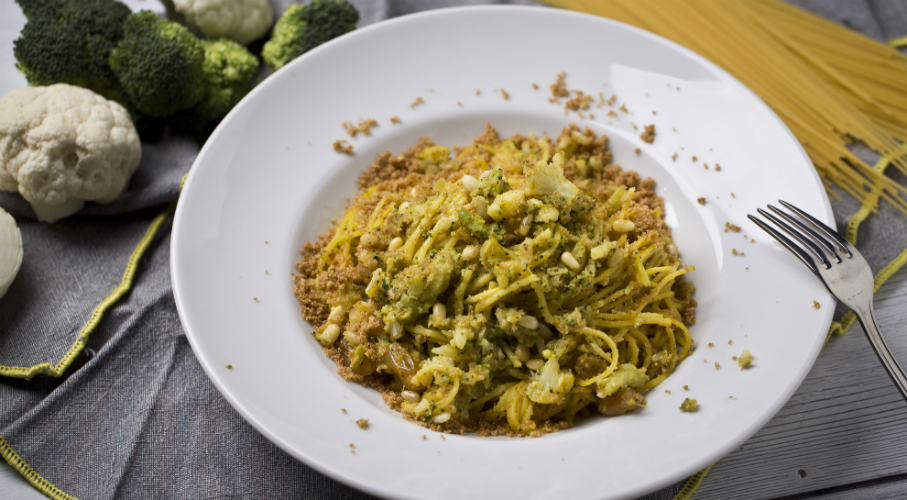 Se fierbe usor conopida ( blansare ), adica apa sa fierbe pana cand a dat un clocot daca legumele sunt necongelate , adica crude. Se pune intr-o tigaie ceapa cu ulei de masline . Se adauga conopida si broccoli si fileul de ansoa. Se fierbe pastele in apa cu sare. Se adauga la sos muguri de pin, si punem stafidele albe tinute in prealabil in apa calduta. Se adauga spaghettele fierte. Se aranjeaza de sare si piper. Se adauga pesmetul usor prajit.