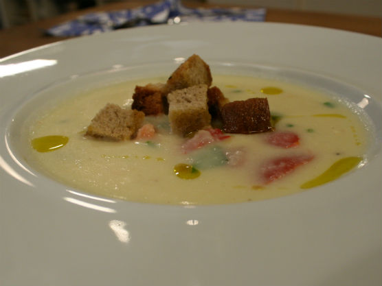 Se taie prazul felii, se căleşte într-o tigaie cu unt şi cu o lingură de ulei de măsline şi cu un căţel de usturoi. Se adaugă conopida ruptă în bucăţele şi cartofii tăiaţi cubuleţe. Se adaugă apă, se sărează şi se fierbe acoperit 20 min până legumele devin foarte fragede. Se lasă apoi la răcit şi se mixează cu apa în care a fiert. Se pune crema obţinută în cratiţă, se adaugă smântâna, laptele, roşiile tăiate cuburi şi busuiocul, apoi se fierbe încă câteva min. Feliile de pâine se taie în bucăţele mici, se pun într-o tigaie în cuptor, împreună cu cimbrul, ulei de măsline şi după gust usturoi. Supa cremă se serveşte cu crutoane şi arpagic.