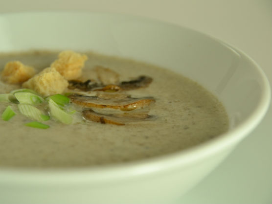 Ceapa şi ciupercile se pun la călit în ulei încins. Se lasă 6 min la foc mediu. Se adaugă sare şi piper după gust, se stinge cu vinul alb şi se lasă aburii de alcool să se evapore după care se adaugă supa de vită. Se lasă la fiert 10 min. Se adaugă smântâna şi parmezanul amestecându-se încontinuu. Se mai dă într-un clocot şi apoi se procesează totul într-un blender până se obţine o cremă fină. Se serveşte într-un bol punându-se deasupra să plutească felii de ciuperci prăjite şi rondele de ceapă verde. Alături în farfurie suport se aşează un recipient mic cu crutoane de pâine.