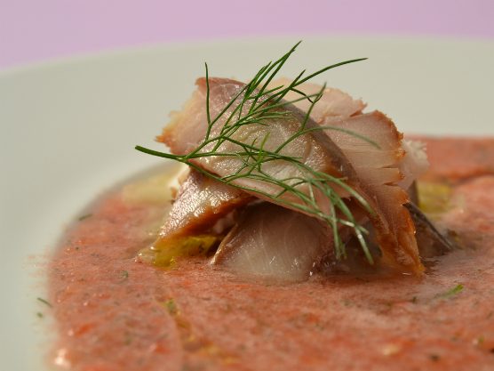 Într-un blender se mixează 6 roșii medii, 40 ml ulei, 2 fire mărar, sare,1/2 linguriță piper negru, 1 ardei iute roșu proaspăt, până când se obține o pastă foarte fină și densă. Această pastă se așează pe farfuriile de servire după care se adaugă 50 g castravete și 40 g ardei gras, tocate foarte fin. Deasupra, cu ajutorul unei linguri punem cca 50 g iaurt gras de bivoliță sau oaie, în așa fel încât să plutească. Se adaugă și 200 g macrou/hering afumat sau batog, tăiat felii transversale subțiri și așezate în așa fel încât să stea la suprafață. Poftă bună și gătiți cu gust.