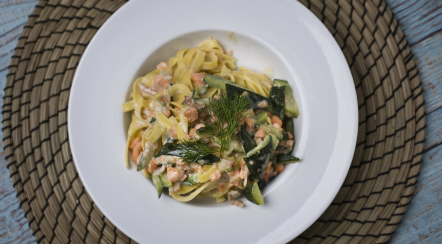 Se calesc zucchini taiati frumosi intr-o tigaie cu unt. Se adauga bacon. Se stinge cu vodka. Se fierb tagliatellele. Se adauga tagliatelle la sos. Se scot de pe foc si se adauga branzaturile. Se verifica de sare si piper. Se amesteca incet.