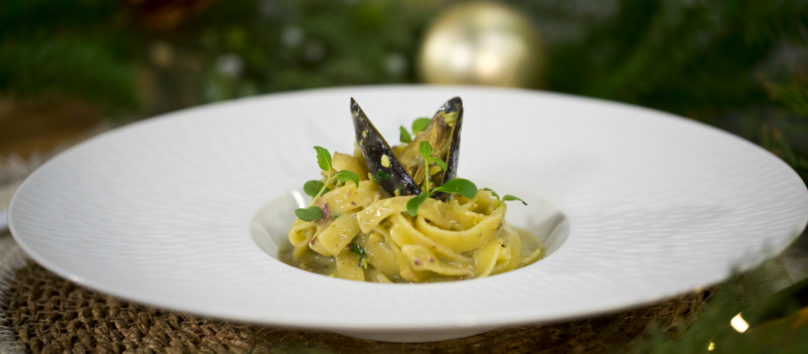 Se pun pe farfurie inainte pastele apoi sosul si apoi scoicile.