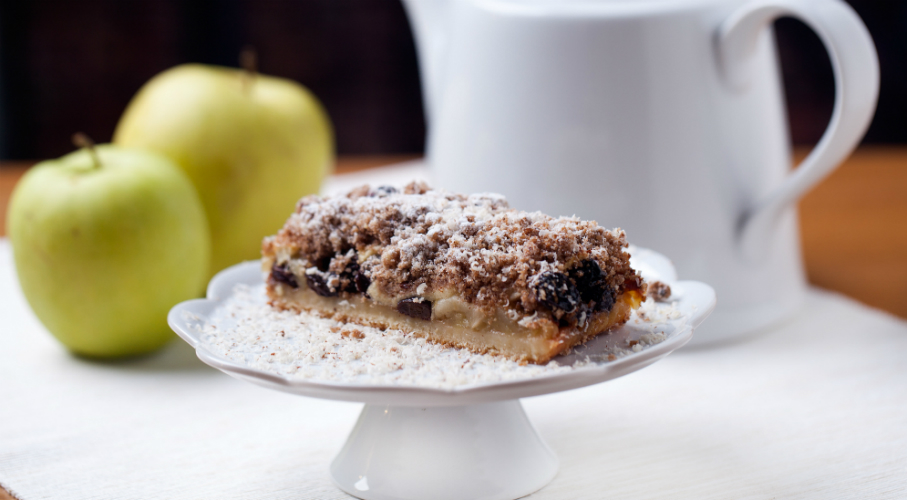 Amestecăm ingredientele aluatului, frământăm coca, apoi o împachetăm în folie de plastic şi o punem în frigider pentru 2 ore. După asta, aşezăm aluatul în forma de copt, îl înțepăm cu furculiţa şi-l coacem în cuptor timp de 10 minute, la temperatura de 180 de grade. Într-o tavă mai mare, amestecăm merele mărunţite cu stafidele înmuiate în rom şi cu zeama de lămâie, apoi le aşezăm pe aluat. Presărăm prăjitura cu pesmet şi o coacem la 190 de grade, până când devine aurie.
