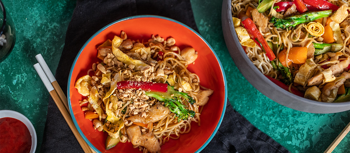 Felhevítjük a wokot vagy serpenyőt. Kevés olajon pirosra sütjük a csirkefalatokat, félretoljuk, majd újabb adag olajon megpirítjuk a fokhagymát és a zöldségeket. Ezeket is félretoljuk, a wokba ütjük a 2 tojást és elkeverve lepirítjuk ezeket is. A végén hozzáadjuk a kifőtt tésztát és az egészet meglocsoljuk szójaszósszal, osztriga szósszal és rizsecettel és alaposan összeforgatjuk. Frissen őrölt borssal és sok finomra vágott újhagymával tálaljuk. Azonnal fogyasztjuk.