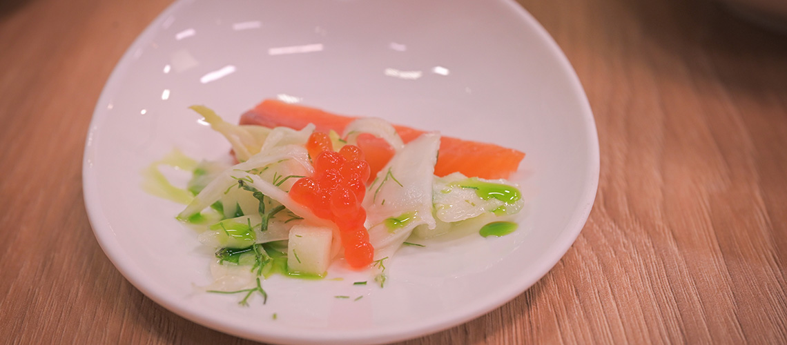 Bazsalikomos garvlax lazac, citrusos édeskömény saláta, lazac ikra