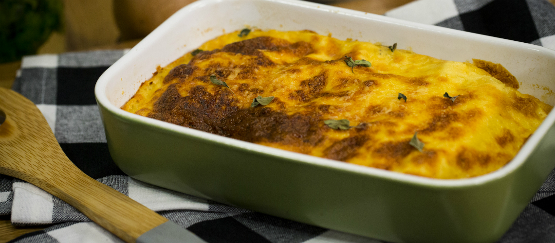 A csirkemellek felét feldaraboljuk, kevés olajban sóval, borssal átsütjük. Miután picit hűlt aprítógéppel alaposan összedaraboljuk. Olajban finomra vágott vöröshagymát és fokhagymát pirítunk és ezen megpároljuk az apró kockára vágott zellergumót. Borssal és friss oregánóval fűszerezzük. Hozzáadjuk az aprított csirkét, majd betöltjük a canelloniba. Vajban lisztet pirítunk, felöntjük tejjel, sózzuk és borssal, valamint szerecsendióval fűszerezzük. A mártásba reszelt trappistát és parmezánt szórunk, kikeverjük kevés tejszínnel és egy tojás sárgájával és a vajazott sütőtepsibe tett canellonira öntjük. 170 fokos sütőben 50 perc alatt készre sütjük.