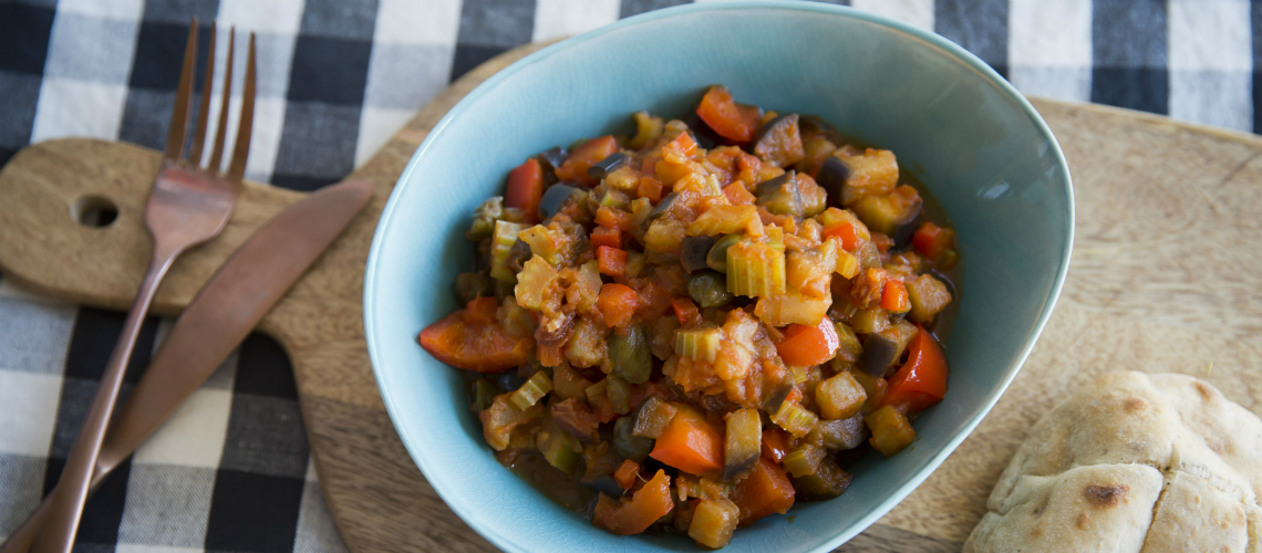 Egy nagy, vastagfalú lábasban az olajban üvegesre dinszteljük a finomra aprított hagymát. Hozzáadjuk a felkarikázott szárzellert, a felkockázott kaliforniai paprikát, néhány percig pirítjuk. Ekkor felöntjük a paradicsomszósszal, majd beletesszük a mazsolát (nem szükséges beáztatni) és az átöblített kapribogyót. Sóval, borssal ízesítjük. Fedő alatt puhára pároljuk a zöldségeket. Közben egy lábasban vizet forralunk, sózzuk, és a padlizsánt felkockázzuk (héjastul), majd kb. 5 perc alatt puhára főzzük. A puha, leszűrt padlizsánt a paradicsomos raguba keverjük, és egy-két percig összefőzzük. Ekkor, adunk hozzá két evőkanál vörösborecetet, végül igazítjuk az ízeket, sóval, borssal, pici nádcukorral, chilivel.