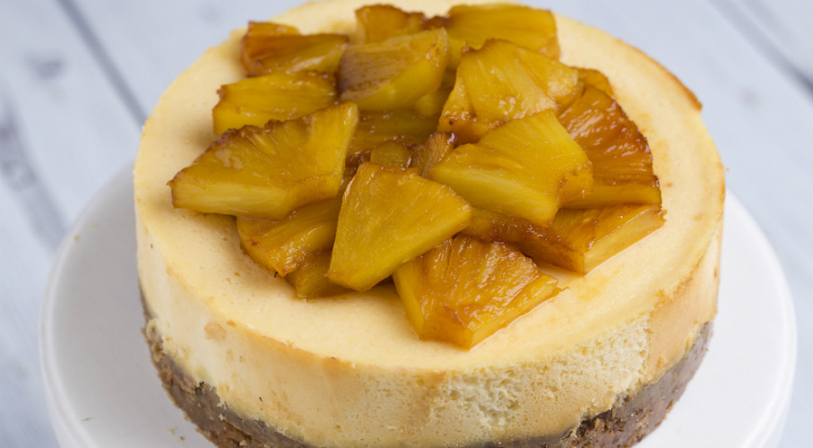 Egy 20 cm átmérőjű kapcsos tortaforma alját kibélelünk sütőpapírral és bekenjük vajjal. A tésztához a vajat a cukorral robotgépben krémesre keverjük. Alacsony fordulatszámon hozzákeverjük a darált diót, a kandírozott narancshéjat, és a lisztet. Ha a tészta összeállt, lisztes kézzel az előkészített tepsi aljára nyomkodjuk, és 160 fokra előmelegített sütőbe tesszük. 20 percig sütjük, amíg egy kevés színt kap. Kivesszük, hagyjuk kihűlni, a sütőt pedig 150 fokra visszavesszük. A krémsajtot robotgépben krémesre keverjük a cukorral. Egyenként hozzákeverjük a tojásokat, majd a lisztet is. Hozzáadjuk a tejfölt, épp csak addig keverjük, amíg homogén lesz, hogy ne keverjünk bele levegőbuborékokat. A kekszalapra öntjük. A tortaformát vastagon beburkoljuk alufóliával és egy forró vízzel teli hőálló tálba tesszük, Így sütjük 170 fokra előmelegített sütőben és 50 percig, amíg a sütemény közepe még rezgős marad. A sütőből kivéve hagyjuk kihűlni, kivesszük a formából és legalább 2 órára, de jobb, ha egész éjszakára, a hűtőbe tesszük. Tálalás előtt az ananászt cikkekre vágjuk. Egy serpenyőben felolvasztjuk, majd beletesszük az ananászt ésa rumot és addig hevítjük, amíg megpuhulnak és sziruposra fő. Hagyjuk kihűlni és a torta tetejére rendezzük.