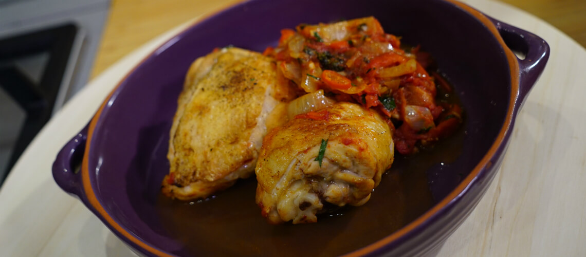 A csirkecombot sózzuk, borsozzuk, és serpenyőben vagy grillen megpirítjuk. A paradicsomot félbevágjuk, a hagymát és a paprikát felszeleteljük, és együtt megfuttatjuk olajon, majd egy villával szétnyomkodjuk a zöldségeket. Amikor a csirkecombon kéreg képződött, beletesszük a paradicsomos szaramura szaftba, megszórjuk borsikafűvel, és fedő alatt puhára pároljuk. A végén adunk hozzá apróra vágott fokhagymát és petrezselymet.