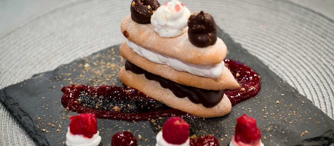 A babapiskótát pohárba tördeljük, rálocsoljuk a málnapürét és rányomjuk a csokikrémet.