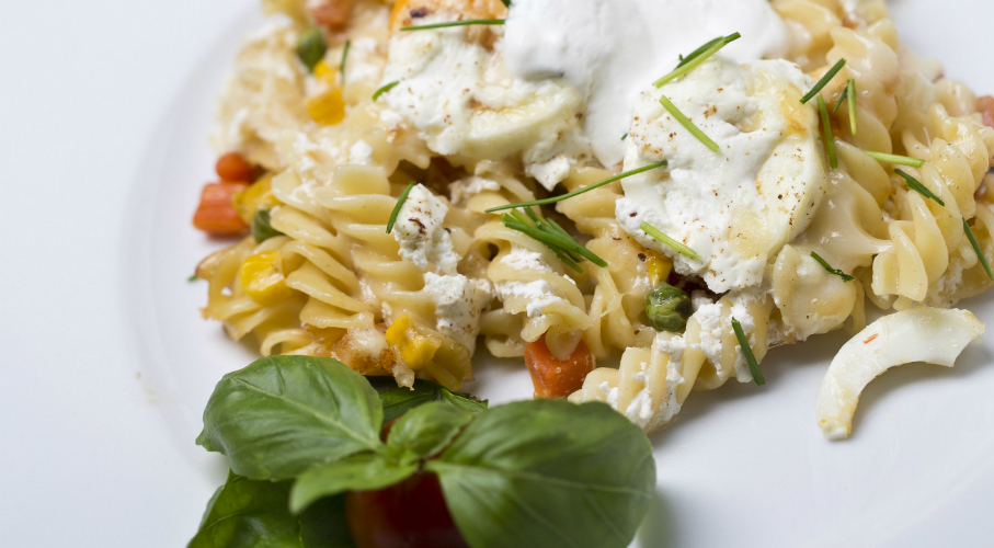 A felkockázott kaliforniai paprikát a zöldségmix-szel együtt vajon megpároljuk. közben félkeményre kifőzzük a tésztát. A jénai kivajazzuk és megszórjuk zsemlemorzsával, a sajtokat lereszeljük, a főtt tojásokat felszeleteljük. A tésztát bekeverjük a tejföllel, majd a kivajazott jénaiba rétegezzük a zöldségekkel, a reszelt sajtokkal és még egy kis tejföllel. Közben megszórjuk frissen reszelt szerecsendióval, a tetejére főtt tojást teszünk. A sütőben 185 fokon 20 perc alatt készre sütjük.