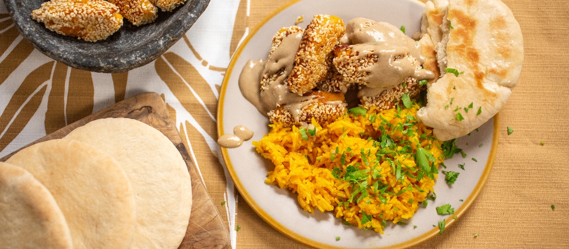 A rizshez felhevítjük az olajat, hozzáadunk 1 tk kurkumát és egy csipet cayenne borsot. Rádobunk 1 csésze basmati rizst, átforgatjuk, 1 percig pirítjuk, majd felöntjük 2 csésze vízzel és közepesen alacsony lángon puhára gőzőljük.