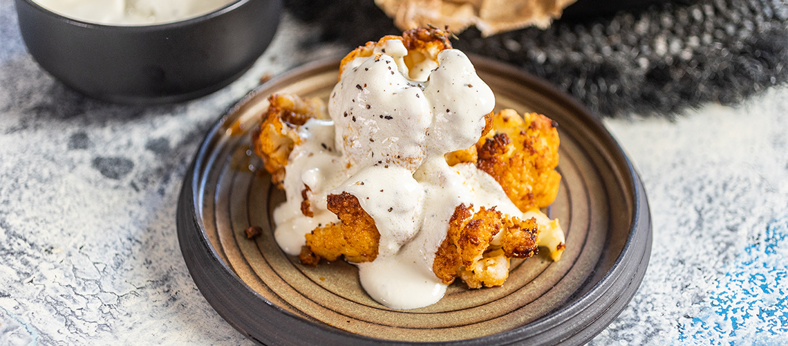 A vajat elkeverjük a pirospaprikával, a reszelt fokhagymával, a római köménnyel, valamint sóval és borssal ízesítjük. A karfiolt megkenjük a fűszeres vajjal, és 200 fokos sütőben 20-25 percig sütjük, amíg meg nem pirul.
