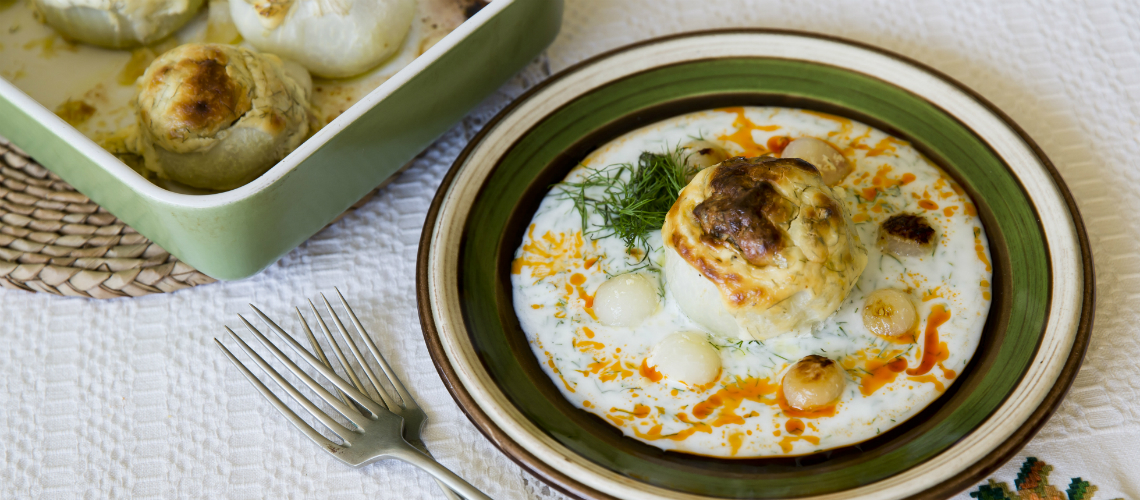 A fiatal karalábékat meghámozzuk, és karalábévájó segítségével a közepüket kivágjuk. A kivájt részeket felaprítjuk, majd egy nagy serpenyőben, vajon puhára dinszteljük. Közben hozzáadjuk a felaprított gombát, és azt is készre pároljuk. Elkeverünk benne 1 tojást, 1 evőkanál tejfölt, és 2 evőkanál zsemlemorzsát. Ezzel megtöltjük a kivájt karalábékat. Kivajazott tepsibe, vagy jénaiba állítjuk, a tetejét meglocsoljuk a kaporral elkevert tejföllel, majd 200C fokos sütőben kb. 45-50 perc alatt megsütjük, hogy a karalábé megpuhuljon. Langyosan, fokhagymás joghurttal és paprikamagolajjal adjuk.