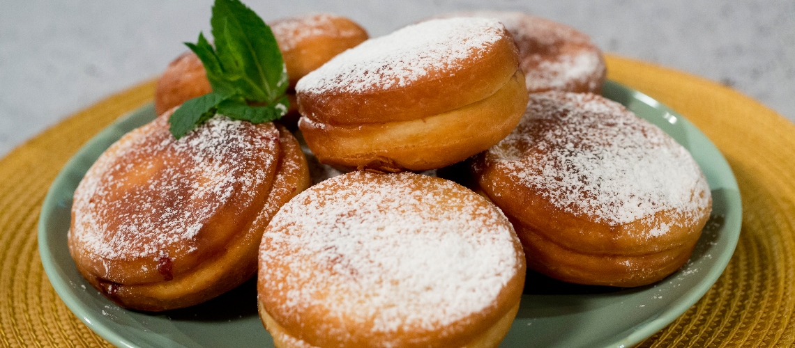 Letakarjuk egy konyharuhával, és meleg helyen 1 óra alatt a duplájára kelesztjük. Ha megkelt, lisztezett felületen ujjnyi vastagságúra nyújtjuk, és köröket szaggatunk belőle. Minden második körre teszünk egy kanál lekvárt.