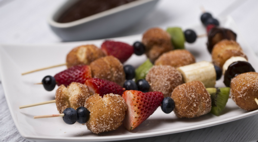 A tejben felfuttatjuk az élesztőt egy kis cukorral, majd a liszttel, tojással és maradék cukorral ledagasztjuk és amikor kezd összeállni, hozzáadjuk a vajat. A tésztát kelni hagyjuk, majd kinyújtjuk, kiszaggatjuk és 15-20 percet kelni hagyjuk. Bő olajban kisütjük. A korábban kisütött fánkok közepéről kiszaggatott kis golyókat is kisütjük olajban. Friss gyümölcsökkel nyársra húzzuk. Olvasztott csokiba vagy fahéjas kristálycukorba forgatjuk, mártjuk a golyókat.