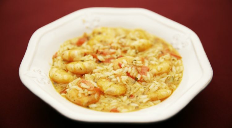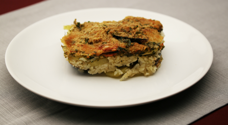 Egy serpenyőben az olívaolajon megpároljuk az apróra vágott fokhagymát és petrezselymet, majd beletesszük a jól megtisztított kagylókat. Fedő alatt addig pároljuk, míg a kagylók kinyílnak. Közben még hozzáadunk egy kevés meleg vizet. Vékony karikákra szeleteljük a krumplit. Egy tűzálló tálba rakunk egy réteg krumplit, aztán egy sor kagylót, parmezánnal meghintjük, lenyomkodjuk, és rászórjuk a rizst. A rétegezést tovább folytatjuk ebben a sorrendben, legfelülre héj nélküli kagyló kerüljön. A kagylók tetejére a prézliből, petrezselyemből és parmezánból készült keveréket terítünk, és meglocsoljuk kevés olívaolajjal.