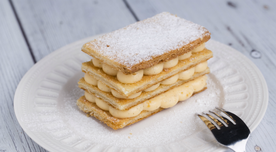 Egy sütőpapírt vékonyan bekenünk olajjal. Egy sütőlapra tesszük és ráterítjük a leveles tésztát. Ezt is megkenjük egy kevés olajjal és finoman megszórjuk kristálycukorral. Leterítjük egy újabb sütőpapírral és lenyomjuk egy sütőlemezzel vagy tepsivel. 200 fokra előmelegített sütőbe tesszük 15 percre. Kivesszük a sütőből, óvatosan lehúzzuk a sütőpapírt a tészta tetejéről, megfordítjuk a tésztalapot és megszórjuk ezt az oldalát is cukorral. Visszatesszük a sütőpapírt és a sütőlemezt és újabb 10 percre visszatesszük a sütőbe. Azért kell egy tepsivel vagy sütőlemezzel lenyomni a tésztát, hgy sütés közben ne emelkedjen meg. A sütőből kivéve levesszük a papírt és a sütőlemezt, a ropogósra sült tésztát óvatosan deszkára tesszük és éles késsel egyforma méretű tégalalokra vágjuk. A krémhez a tojássárgáját a cukorral és a vaníliával egy közepes lábosban fehérre keverjük, hozzáadjuk a lisztet és a keményítőt, és simára keverjük. A tejet egy másik kis lábosban felforraljuk, majd fokozatosan, kis adagokban a tojásos keverékhez keverjük. Közepes lángon újra felforraljuk, közben folyamatosan kevergetjük. Nyomózsákba töltjük, lehűtjük és megtöltjük a krémmel a lapokat – egy süteményhez 3-4 lapot használunk.