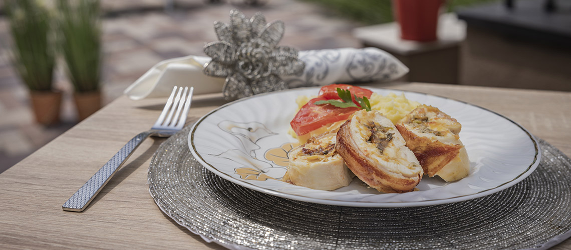 A gombás töltelékhez egy serpenyőben olajon hagymát dinsztelünk. Mikor már üveges a hagyma, akkor az előzőleg késsel apró darabokra kapargatott csirkemájat a hagymára öntjük. Elkeverjük, és hagyjuk összepirulni a hagymával, majd borsozzuk. Két zsömlét kettébe törünk és vízbe áztatjuk. Mikor a májnak már szép színe van, akkor előfőzött darált gombát teszünk a máj mellé. Kisvártatva jó bőven teszünk hozzá petrezselymet, és 3 db darált főtt tojást is. Az áztatott zsömléket alaposan kinyomkodjuk, és azt is a töltelékhez adjuk. Összedolgozzuk és enyhén sózzuk borsozzuk. 2 tojást is ráütünk, azzal is elkeverjük. Az egész csirkemellet bevágjuk (nyitott szeletet készítünk) és klopfolni kezdjük, óvatosan, hogy ne essen szét a csirke. Sózzuk. A tölteléket bele adagoljuk a szétnyújtott csirkemellekebe, feltekerjük, majd bacon szeletekbe csavarjuk és olajozott tepsiben 180 fokos sütőben megsütjük. Sütés előtt díszíthetjük paradicsom szeletekkel is. Köretként krumplipürét kínálhatunk hozzá.