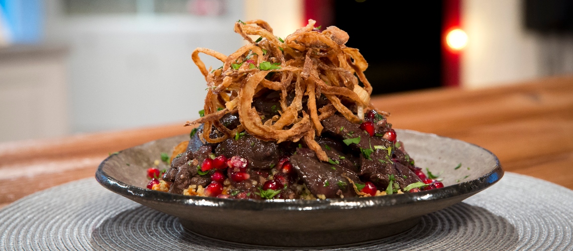 Ugyanebbe a serpenyőbe beletesszük a félkarikára vágott lilahagymát, hozzáadjuk a vajat és pár perc alatt üvegesre pároljuk. Amint a hagyma összeesett és elkezd barnulni, hozzáadjuk a felaprított fokhagymát, valamint a fűszereket. Egy-két percig pirítjuk és visszatesszük bele a csirkemájat. Átforgatjuk majd ráöntjük a gránátalma szirupot, hozzáadjuk a barna cukrot és addig főzzük, amíg a szaft be nem sűrűsödik. A legvégén meglocsoljuk citromlével, hozzáadjuk a gránátalma magokat és adunk még hozzá sót, ha szükséges. Tálaláskor friss korianderrel megszórjuk.