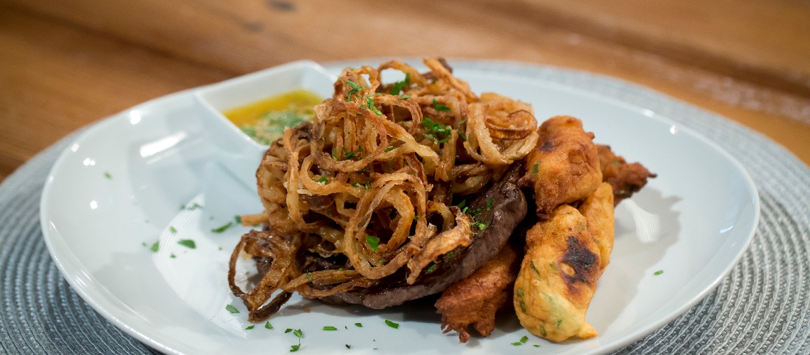 A hagymás rostélyoshoz a vöröshagymákat megpucoljuk, majd fél centi vastag szeletekre vágjuk, karikáira szedjük és megforgatjuk a lisztben. 180 fokos olajban aranybarnára sütjük. Majd tálalásig 130 fokos sütőbe tesszük száradni, hogy ropogós maradjon.